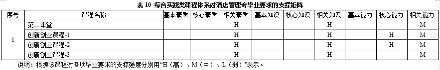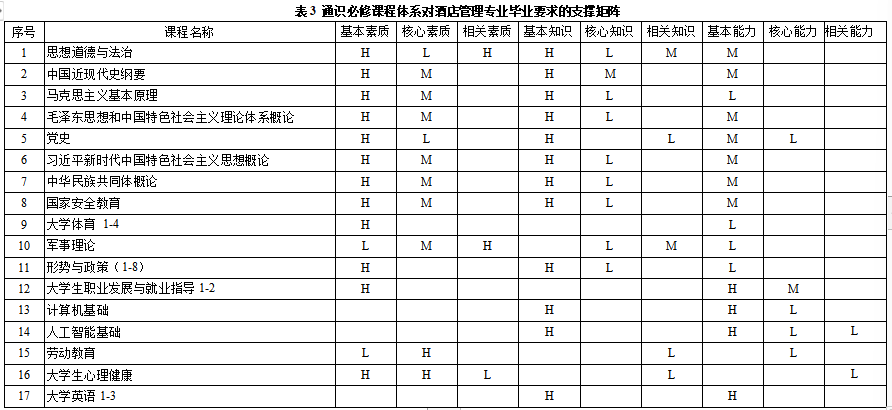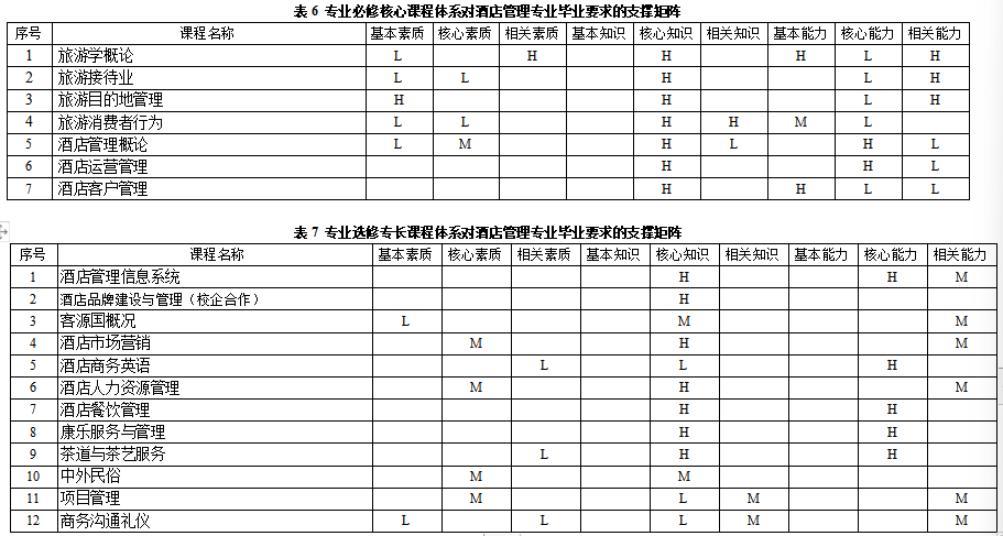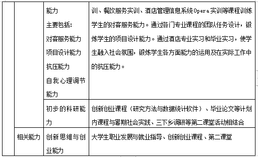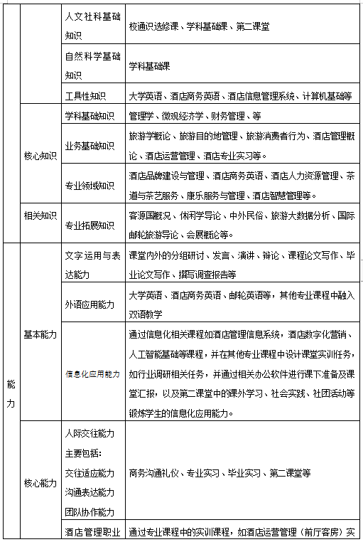 本专业员工基础能力要求为具备较熟练的外语沟通和国际交流能力,熟悉现代办公软件的使用。核心能力要求为掌握酒店经营管理的基本能力,如前厅服务与管理知识与能力、客房服务与管理知识与能力、餐饮服务与管理知识与能力、酒店营销与策划知识与能力等;具备酒店基层岗位的实践操作能力;掌握服务场景下的国际交流礼仪规范;具有一定的酒店产品创新能力;具有初步的科学研究工作能力,具有良好的自我心理调节能力和抗压能力。相关能力要求为具有一定的创新思维能力;具有一定的探索精神和创业能力。