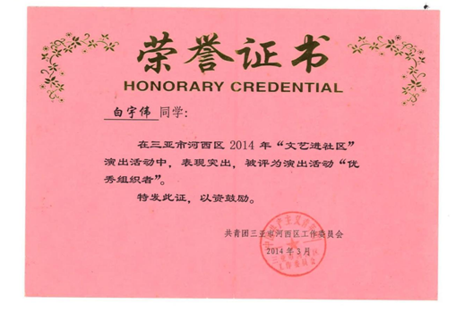 1、2014年3月在三亚市河西区2014年“文艺进社区”演出活动中变现突出,被评为“优秀组织者”。