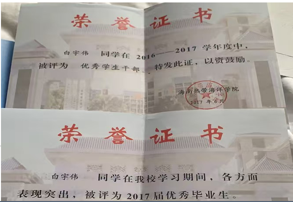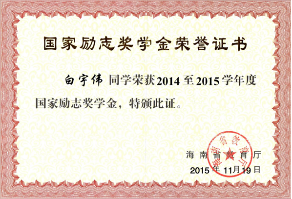 2、2015年9月获得海南省教育厅国家励志奖学金。